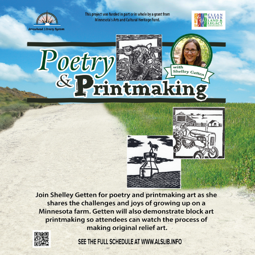 Join Shelley Getten for poetry and printmaking art as she shares the challenges and joys of growing up on a Central Minnesota farm.